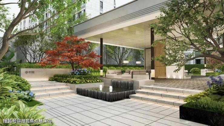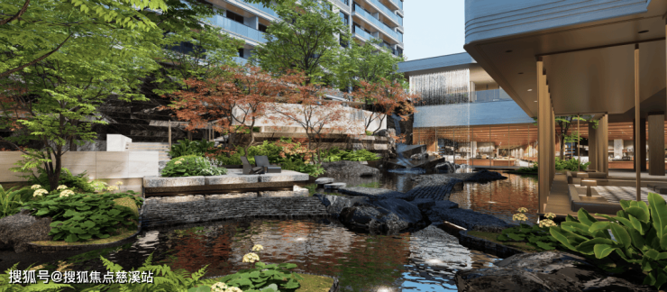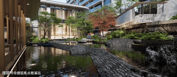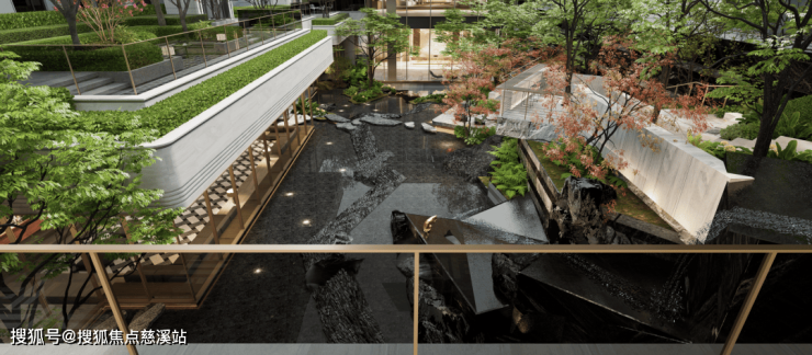 在社区大门背后,利用约5.6米高差,凿出高山叠瀑与曲径通幽、充满自然禅意的下沉庭院。