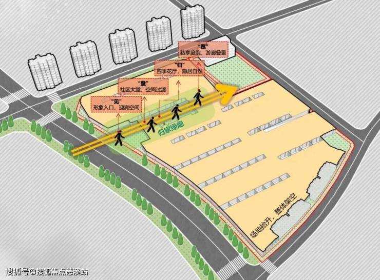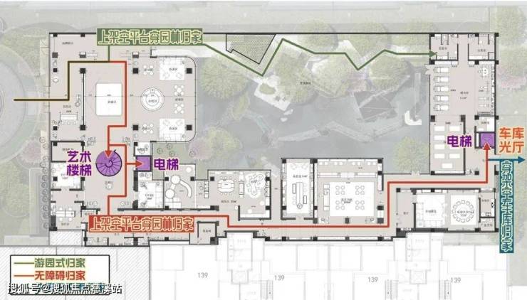 可乘电梯上园区首层无障碍归家,可从会所进入架空车库横穿后快速归家,还可从下沉庭院里的「山道」上架空层顶游园式归家。