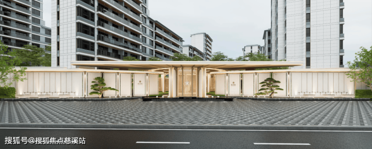整座大门宽约60米,门前采取酒店级别的橄榄绿与星河灰双色拼花地面,两侧的造型松营造强烈对仗感。