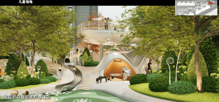 社区东南角借高差打造多维立体的童玩王国「海棠秘谷」,让孩子们在高低落差间释放天性。