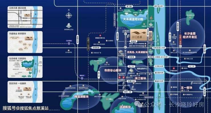 项目直距约500米即达湘江畔;长沙网红打卡地月亮岛,开放后业主步行约500米即可上岛游玩;步行约50米即约3000亩大泽湖近自然湿地公园,启动区即将迎来开园;星悦湖公园、白石湖公园等6大公园环绕,自然栖居。