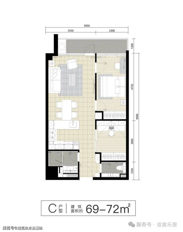 C户型 | 建筑面积约69-72㎡ 2房2厅1厨2卫