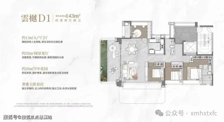楼盘由7栋15—17层的洋房小高层组成,合计340套,最小面积95平,没有特别小,最大是143平四代住宅,定位是品质刚改/改善型社区,也是同安目前第一个四代住宅!