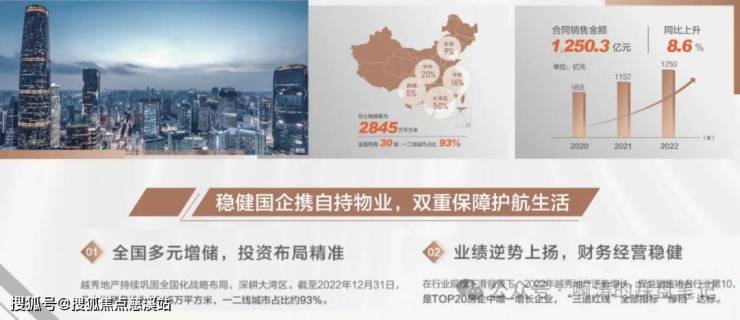【2022年销售额1250.3亿,蝉联广州TOP1;2023年TOP20房企增长率第1,“三道红线"全部指标"绿档"达标。数据来源:克而瑞】越秀地产1983年成立,是中国第一代商品房缔造者41年长足发展,布局全国超30城,深得超100万业主的信赖