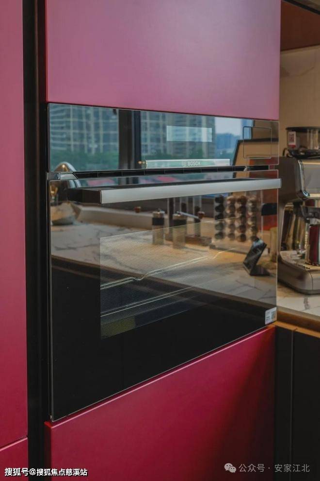 玫瑰岛的上轨移门、紫红色与深蓝色相间的厨房柜体、寒江雪岩板台面、大面积的整体护墙板、木饰面......