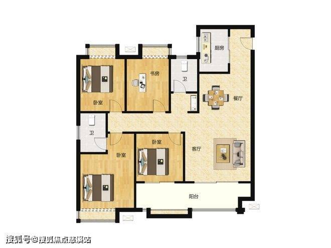 109平的户型亮点是格局比较方正,南北通透。同时有一个南向宽景大阳台,推开窗户即可享受楼下风景。独立多功能书房设计也比较灵活多变,可以根据自己需要来做改动。