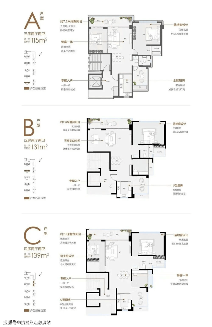户型:主力户型为115-139㎡纯板大平层,三房至四房设计,得房率超100%,配备约7.2-7.6米阔景阳台,主卧面宽约5.6米。