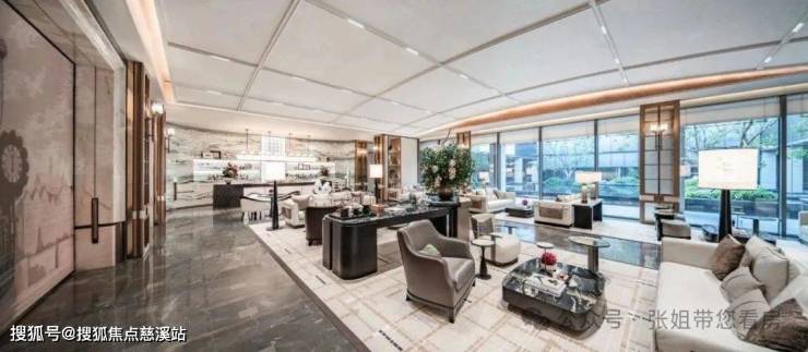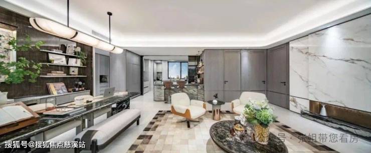 在精装方面,融入酒店化与度假感,大量加入艺术化的处理细节。立面大量运用了鱼肚金岩板、蓝天玉大理石、皮革硬包、尼斯木饰面等材质,营造奢华高雅的视觉感受。局部还会以金属线条进行点缀,以弧线加以装饰,以增加细节的精致。