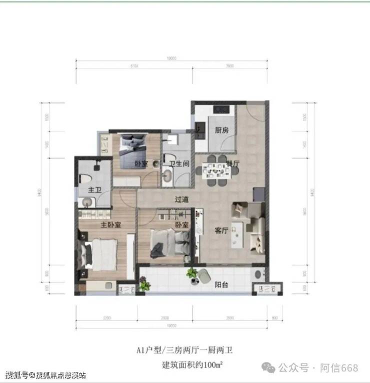1、100平米三房两卫