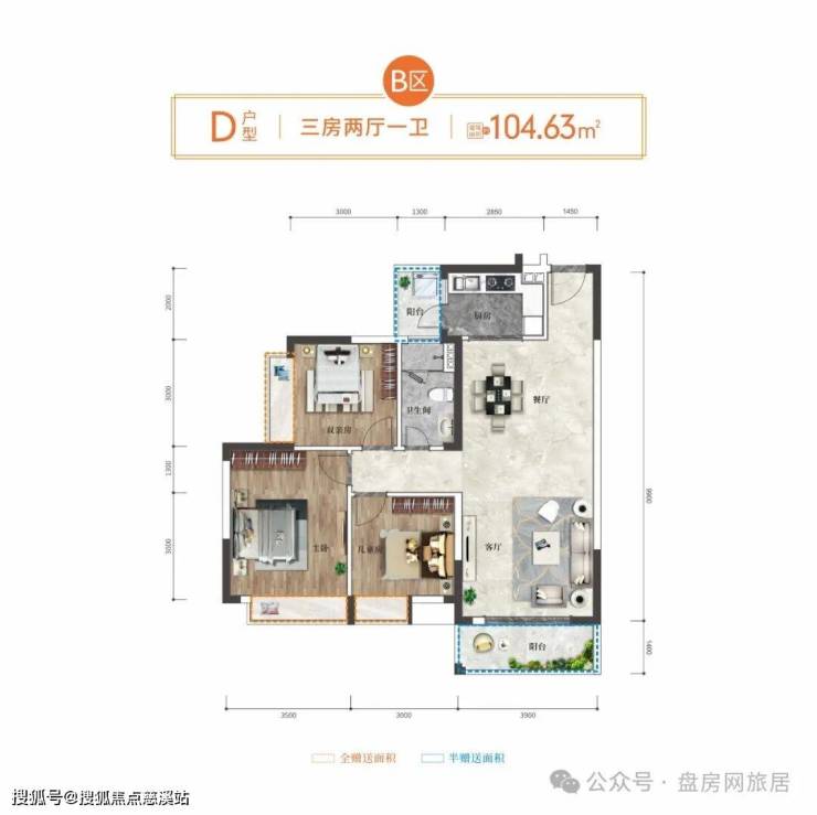 D户型:104平精致3房,奢阔双阳台安放生活与诗意,室室大飘窗百变功能随意造