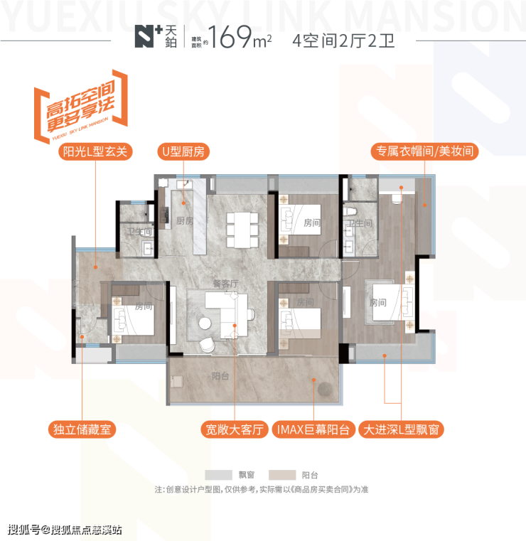 建面约89-169㎡跃级三至四房,跨界共融共生的多元融合。户型均有LDKB互通,保证舒适通风采光及与家人交流互动空间。采用20%阳台建设比例项目,做到2-2.4m的加宽阳台,约800mm进深新规飘窗,相当于增加0.7-0.9㎡使用空间。