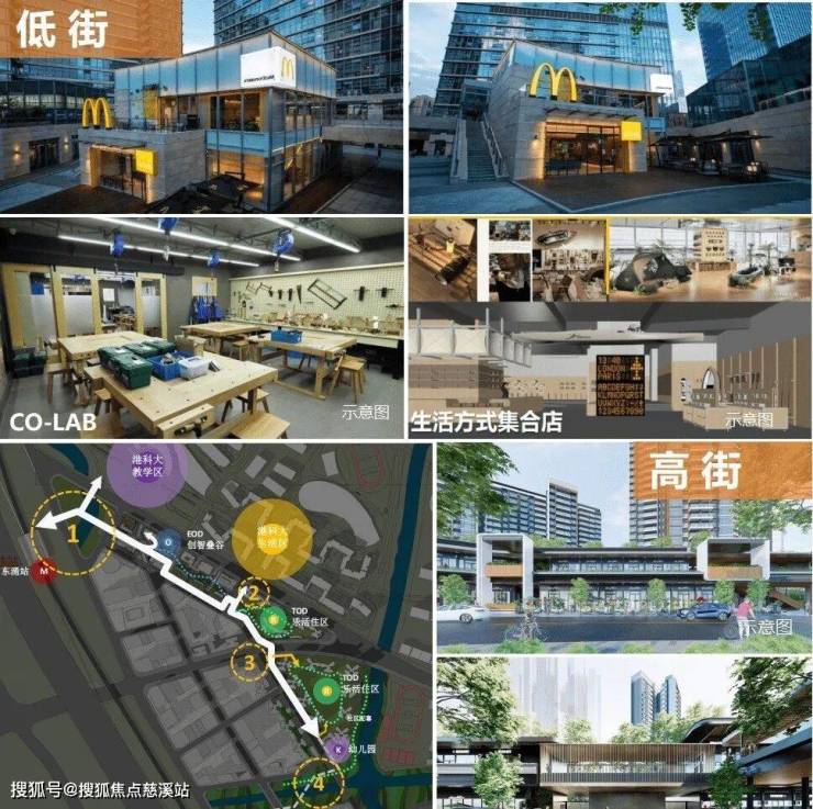 “一个高街” 即超级空中连廊,串联产学研居 4 大板块,无缝连接重要场所;“一个低街” 是约 1.17 万㎡的活力商业街区,汇聚越秀服务生态文创店、港科大的实验店等,充满港味生活气息;“一个广场” 呼应港科大红鸟广场,是 “三区合一” 的起点;“一个盒子” 结合香港文化及设计,设置创新展览办公空间,配备轻餐饮等功能,是板块艺术商业标杆建筑。