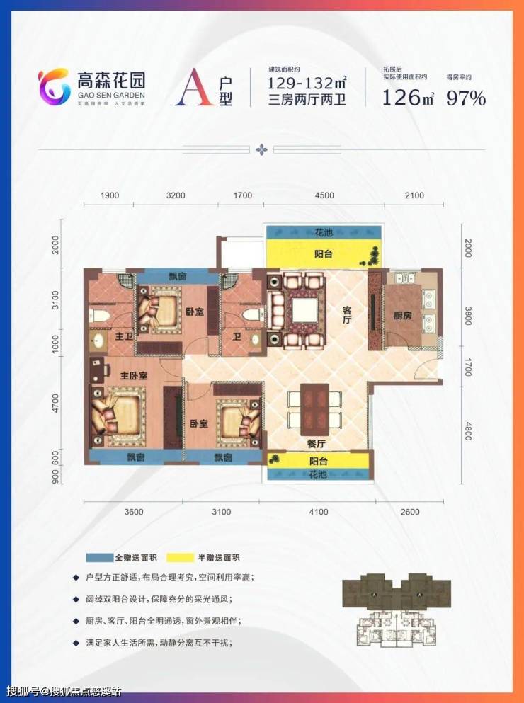 A户型 三房两厅两卫 得房率97%
