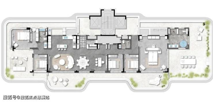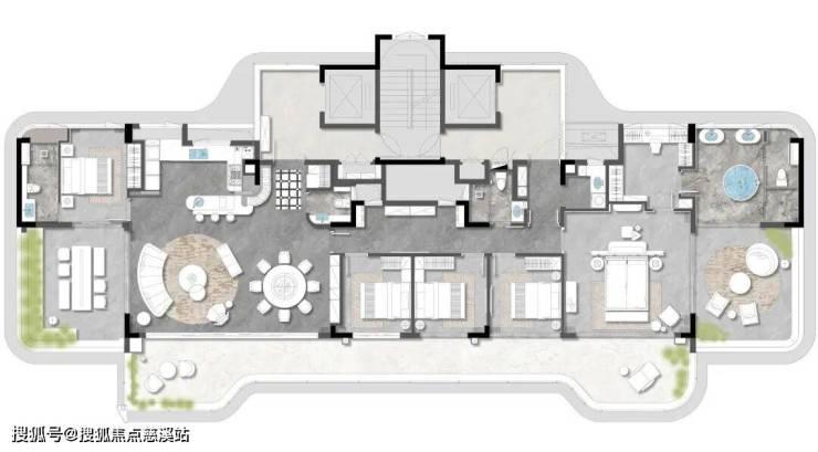 邱德光设计岛心多维共享空间,如社区“灯塔”,以蔚蓝泳池为视觉心脏,用拱廊构建地中海式或南洋风情社交氛围,涵盖恒温泳池、宴会厅、雪茄室、瑜伽室、咖啡厅、茶室等塔尖社交场域。