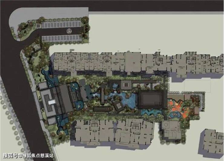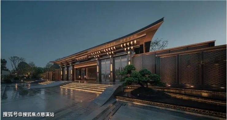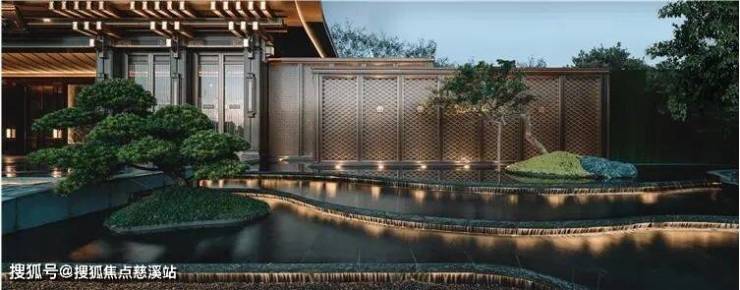 “川泳云飞”源于养云轩大门门楣镌刻,入口对称水景于精致景墙营造入口仪式感和尊贵感;曲线水景打造“川泳”意境,轻盈的曲线演绎“飞”的印象,云纹叠水与云雾效果营造“云”的印象。