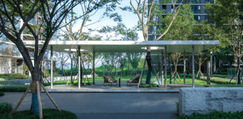云客厅是面向所有业主的开放式会客厅,是社区邻里活动、业主会客的重要场所。云客厅由长条吧台构成具有漂浮感的室外聚会空间,空灵而通透的场所空间,极具现代艺术感,在林荫之下与友人私谈天地。