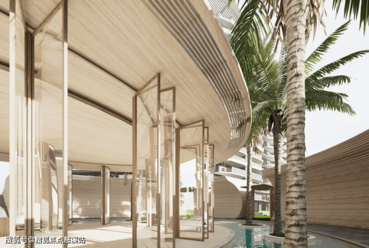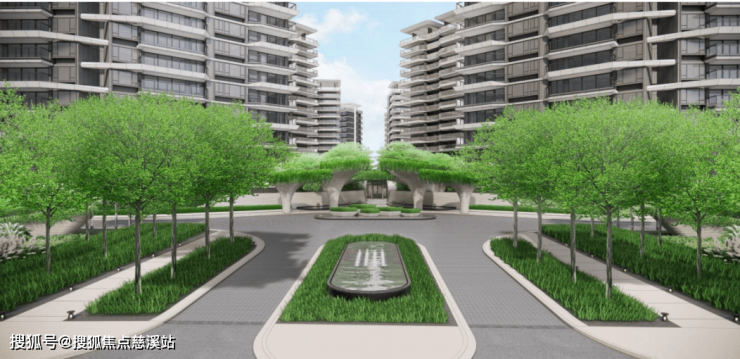 -129米进深四重水景中轴空间造型花池和弧形景墙打造庄严大气仪式感十足的入口空间。