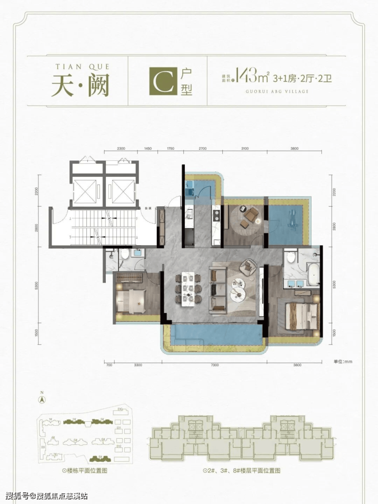 C户型: 建面约143㎡ 3+1房2厅2卫