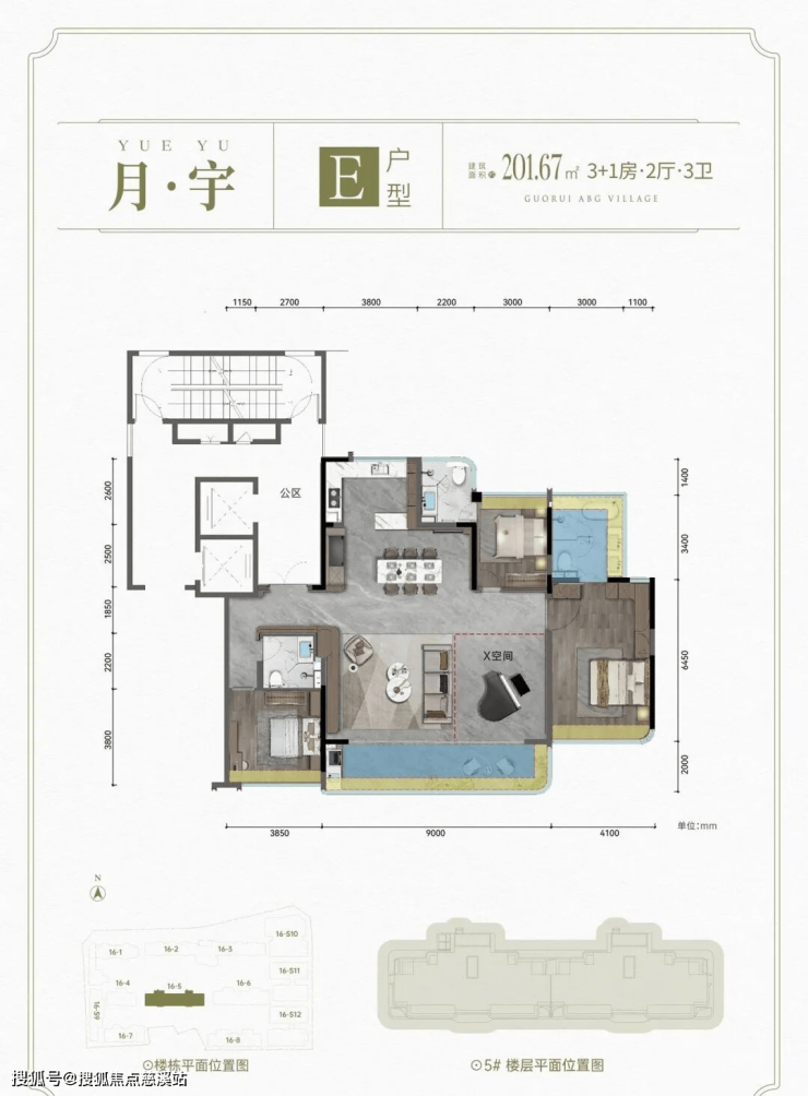 E户型: 建面约201.67㎡ 3+1房2厅3卫