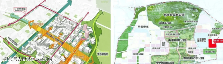 【一园】中央稻田公园为核心开放空间及中央轴心,政务组团、文化中心、体育中心等环绕
