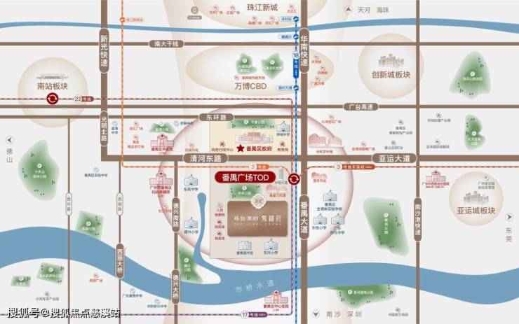 路劲美的·隽樾府所在的番禺广场板块是番禺区的核心区域之一。该区域被定位为番禺区公共服务中心和轨道交通枢纽,正逐步打造成以交通枢纽、行政办公、文化休闲、商业商务等功能为主导的新中心。番禺广场及公园复建工程已经启动,规划建设“两馆一中心”,即文化展览馆、科普活动馆、科技体验中心。地下规划5层约18万平方米的空间,对标花城广场打造“地下商业+地上公园”的发展模式,预计未来将承载千万级客流。随着番禺广场TOD的逐步兑现,整个片区的价值正在快速提升。