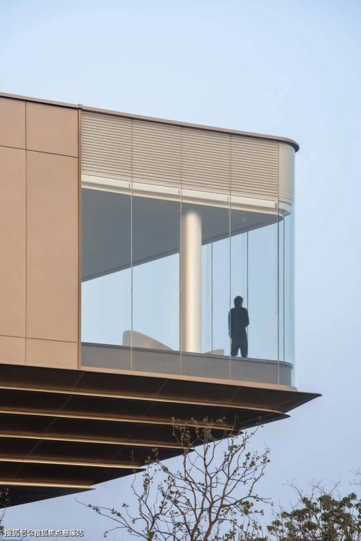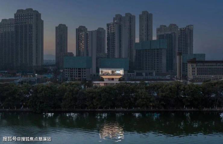 如何对待建筑与场地的关系,成为最初设计思考的起点。场地背江面湖,绿廊环抱,面对这样一个占据湖景绝版的C位,建筑师预设这样的场景,建筑犹如一个被托向空中的玻璃展品,形成城市道路边独特视觉标识。