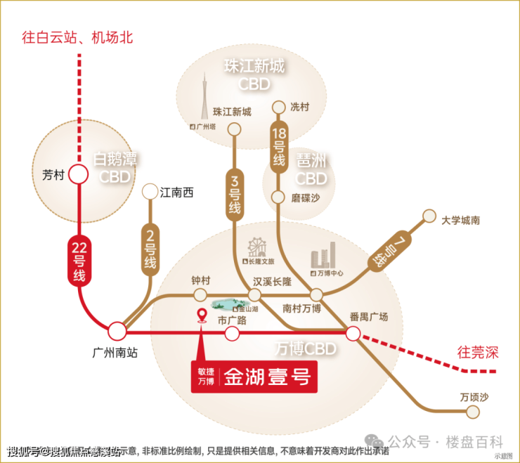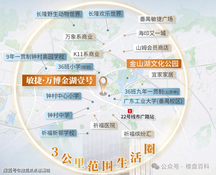 位于广州市番禺区钟村街市广路308号,广州地铁22号线市广站附近;坐落于番禺核心区万博CBD腹地,紧邻金山湖畔,敏捷·万博金湖壹号北向瞰湖、南向望山,有着3.21的容积率低密舒环境,又能享受万博CBD的商业、产业资源带来的红利。