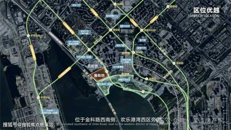 位于宝安区新安街道甲岸南路与金科路交叉口西南侧,坐落于欢乐港湾西岸旁,与前海华侨城JW万豪酒店相邻,距离海岸线仅约300米。
