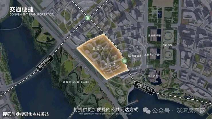 地块位于宝安中心区,紧邻沿江高速,坐拥湾区书城、湾区之光摩天轮、青少年宫、图书馆、滨海演艺中心、欢乐剧场等市级文化地标,与腾讯全球总部企鹅岛仅一水之隔。