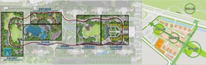 地块引入城市公园和社区公园,直面城市公园的青年社区,城市公园串联三个住宅区块:引入青年运动,儿童乐园,老年活动和公园商业概念;社区公园设有运动、老年活动等让每个区块能够实现共享实用。