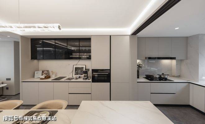 特别是在北向餐厨区域的设计,刻意拉长了进深,将中厨、西厨、岛台、餐桌四大功能区完美融合在了一起,动线顺畅、布局合理。未来宴请亲朋好友非常有排场,同时也让客厅的功能更加纯粹。不管是孩子嬉戏、家庭对话、还是一个人的午后悠闲时光……在这里都能够完美承载。