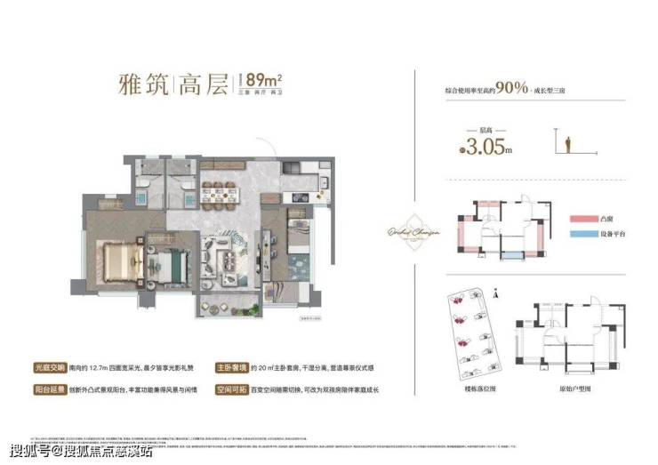 1、层高3.05m,综合使用率约90%,同等面积多一房;