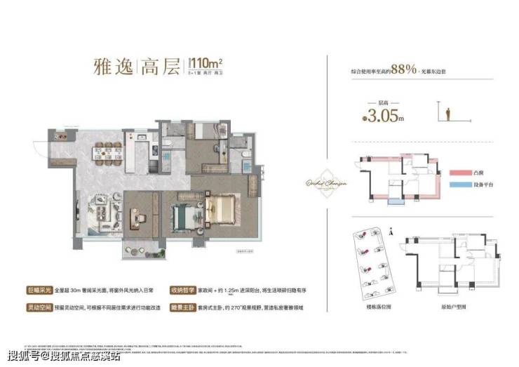 1、层高3.05m,综合使用率约92%,颠覆级拓展(卫生间凸窗、厨房凸窗);