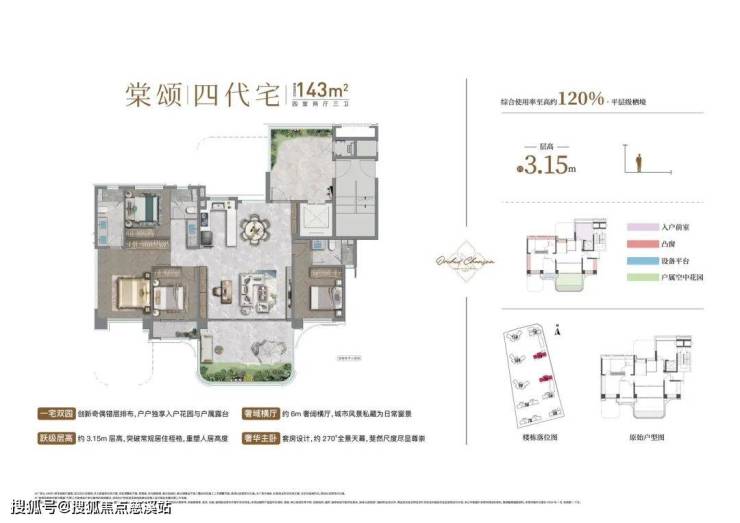 4、总统主卧270°全景天幕、双台盆设计,5、别墅级层高3.15米,层高即空间,15公分即21立方的空间;