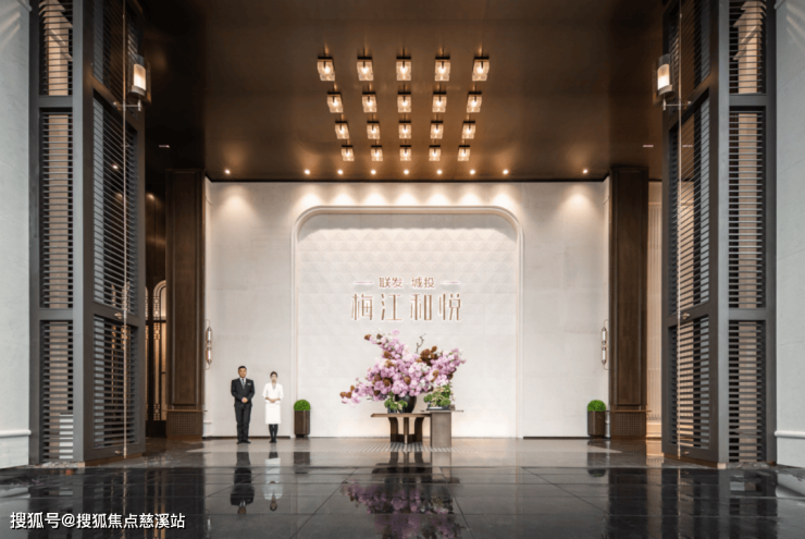 联发城投·梅江和悦精研实景示范区品质,从选材、设计理念、人性化细节三个方面打造最美回家路。社区入口屋顶高达9米,由深色古铜金不锈钢密拼而成,礼序台阶由加厚的黑金沙大规格整石定制而成,整体效果沉稳大气;四季花厅采用外双层内通高的建筑结构布局,形成开放而流动的空间感受;车马厅将顶部管线藏身综合支吊架,地面采用环氧地坪漆,视觉更为明亮开阔,同时灯带随行点亮,营造专属、暖心的归家氛围。