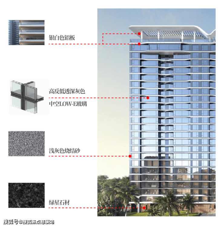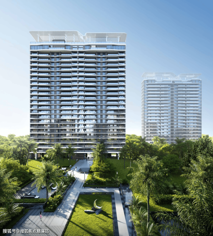 建筑,是社区与城市的第一句对话。鹿城壹号的立面取法极简公建化风格,大面积玻璃幕墙与轻盈铝板的结合,构筑通透挺拔的天际线轮廓。设计从热带自然中提炼线条意象——海浪、椰林的自然元素,让建筑呈现轻盈简约的现代艺术感。