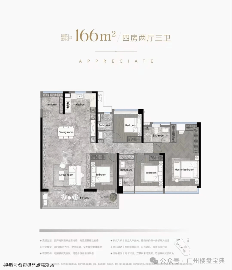 建面166平四房三卫,放大版的142平,做了双主套,约40平的大房厅,景观阳台开间约8.2米。