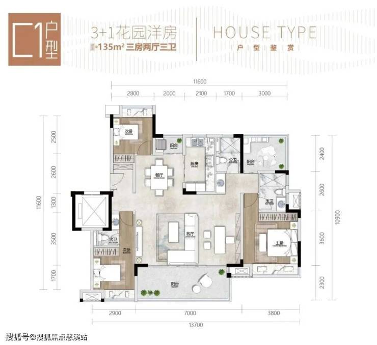 ▲户型:108-135㎡3+1房,一梯两户纯板房