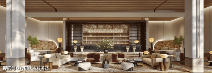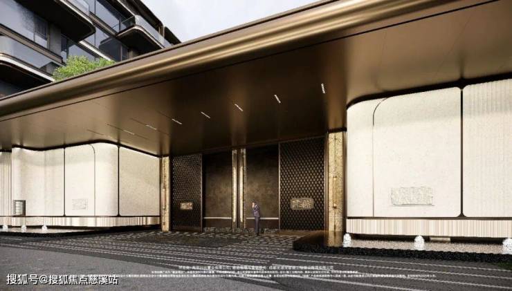 大门处用贝金米黄石材为其底打造了80米的全石材超级城市界面,搭配深古铜铝板点缀。在如此量级的项目中,这种配置算是独一份。包括会所空间也采用了全石材打造,这在新玄武板块是首创,在全南京也是相当罕见。