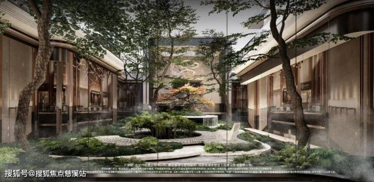 通过“S”型的游园小径去引导视线,“拉长”视觉上的空间效果,融入玄武文脉,下沉庭院中央打造“九转龙鳞”核心景观,配合超白玻璃,未来业主在会所内,也能直接享受和核心景观的视线交汇,真正将山水栖居融入业主日常。