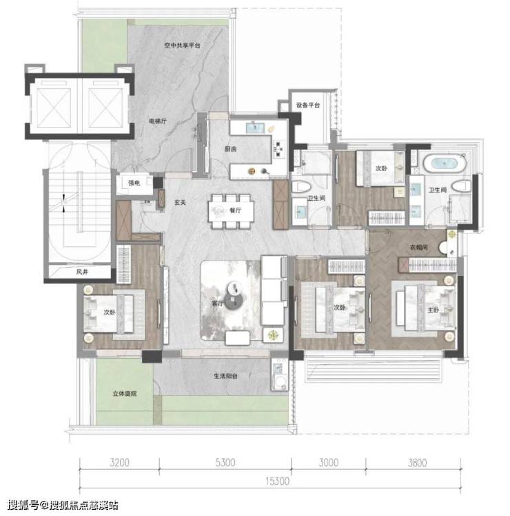 整体南向面宽也做到了极致,约15.3米,每一个朝南的房间,都能沐浴大把阳光或绿意。