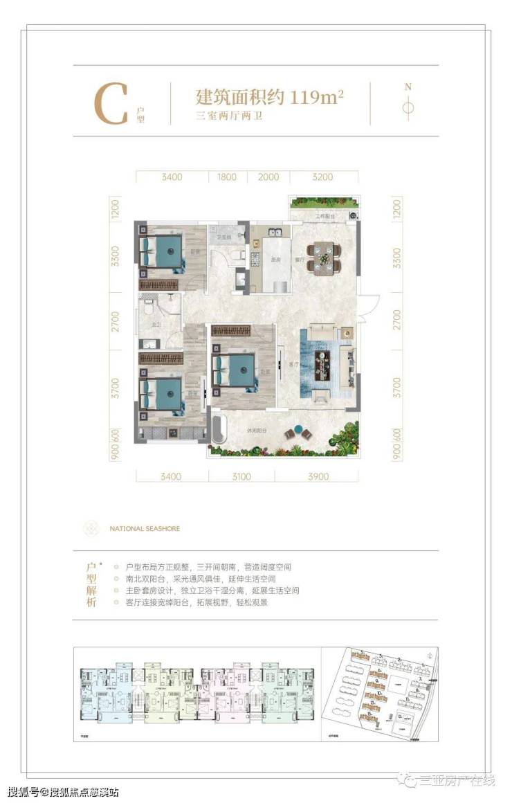 产品|即买即住即享受项目规划12栋6层纯板洋房,1栋业主私属会所,产品建筑面积约109-119㎡装修交付住宅,一楼两户,新中式风格实景洋房,典藏级温泉养生社区。板式结构,南北通透,外立面石材干挂,打造3.2米层高,现已实景呈现,现房现证。C户型119㎡三室两厅两卫