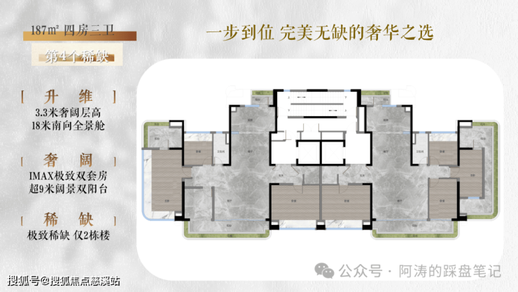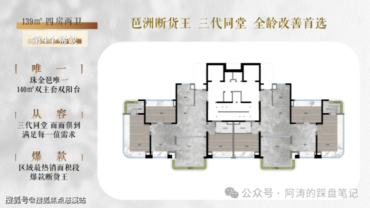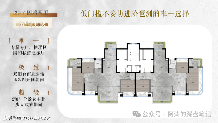 ✓ 面积段涵盖约122、139、187㎡,都是新规户型,均为南北对流双阳台四房,专梯入户,低密纯粹,非常值得期待。