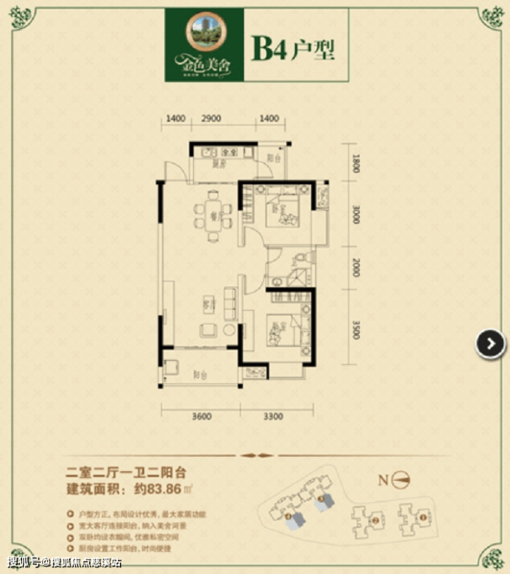 ● B4户型:约83㎡2房2厅1卫