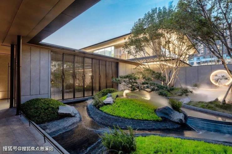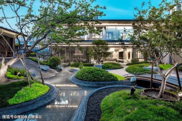 汲取宋代建筑轮廓并配以椒图塑像的山河映秀,四角挑檐向内引水入天井的四水归堂,可以抚琴听曲、会客赏景的秋水长亭,拥有迎宾景致和下沉会客厅的清辉映月,入户大门前颇具归家仪制的朔悦明堂。