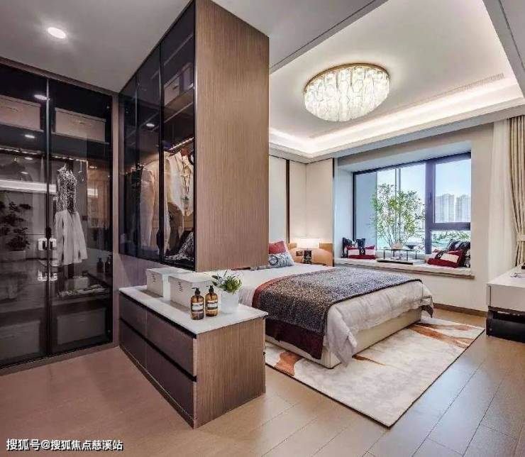 主卧套房设计,搭载独立卫浴、瞰景飘窗,并且为衣帽间也规划了空间,兼备尊崇感与私密性。