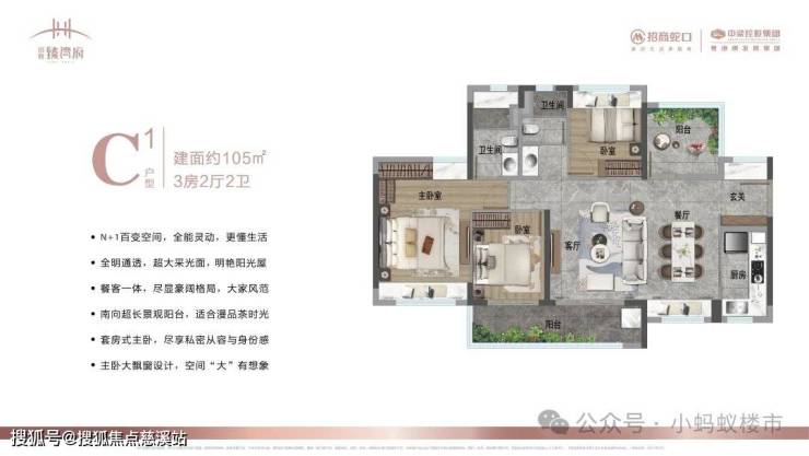 105㎡3+1房:南北双阳台设计,南向6米景观阳台,主卧套房带独立衣帽间,改善升级首选。