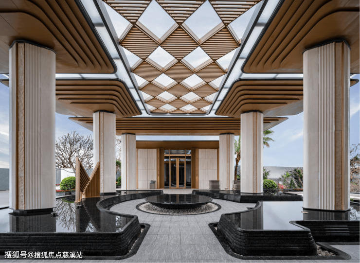 椰林仿生门廊搭配天然石材前台,阳光与庭院乔木交织,宛如星级酒店。