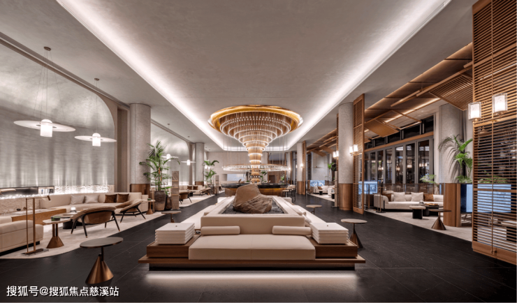 穿过大堂是下沉式水吧区,7米高雨林瀑布叠水顺石流淌,耳畔溪流声伴满眼绿植,五观五感皆是松弛享受。