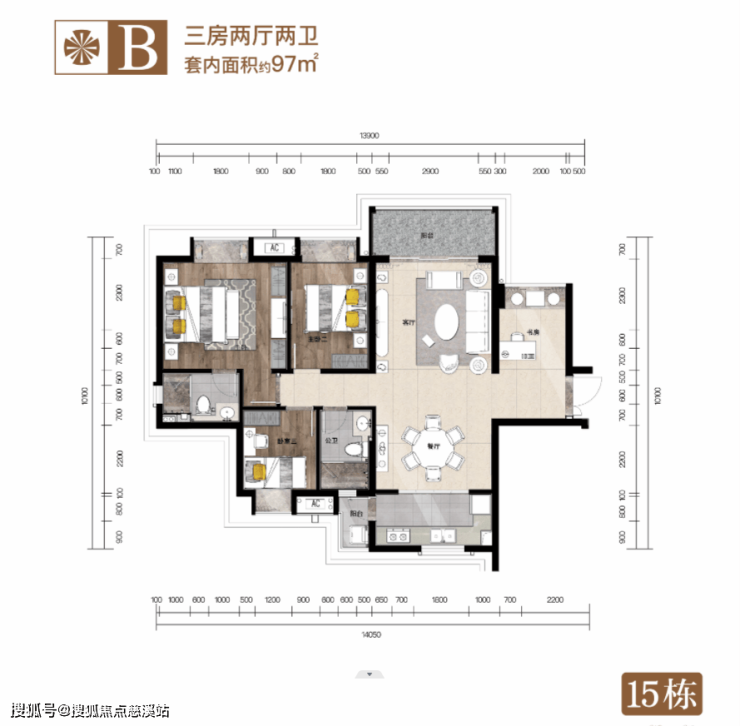 • B户型:建面约108㎡,3房2厅2卫,横厅设计